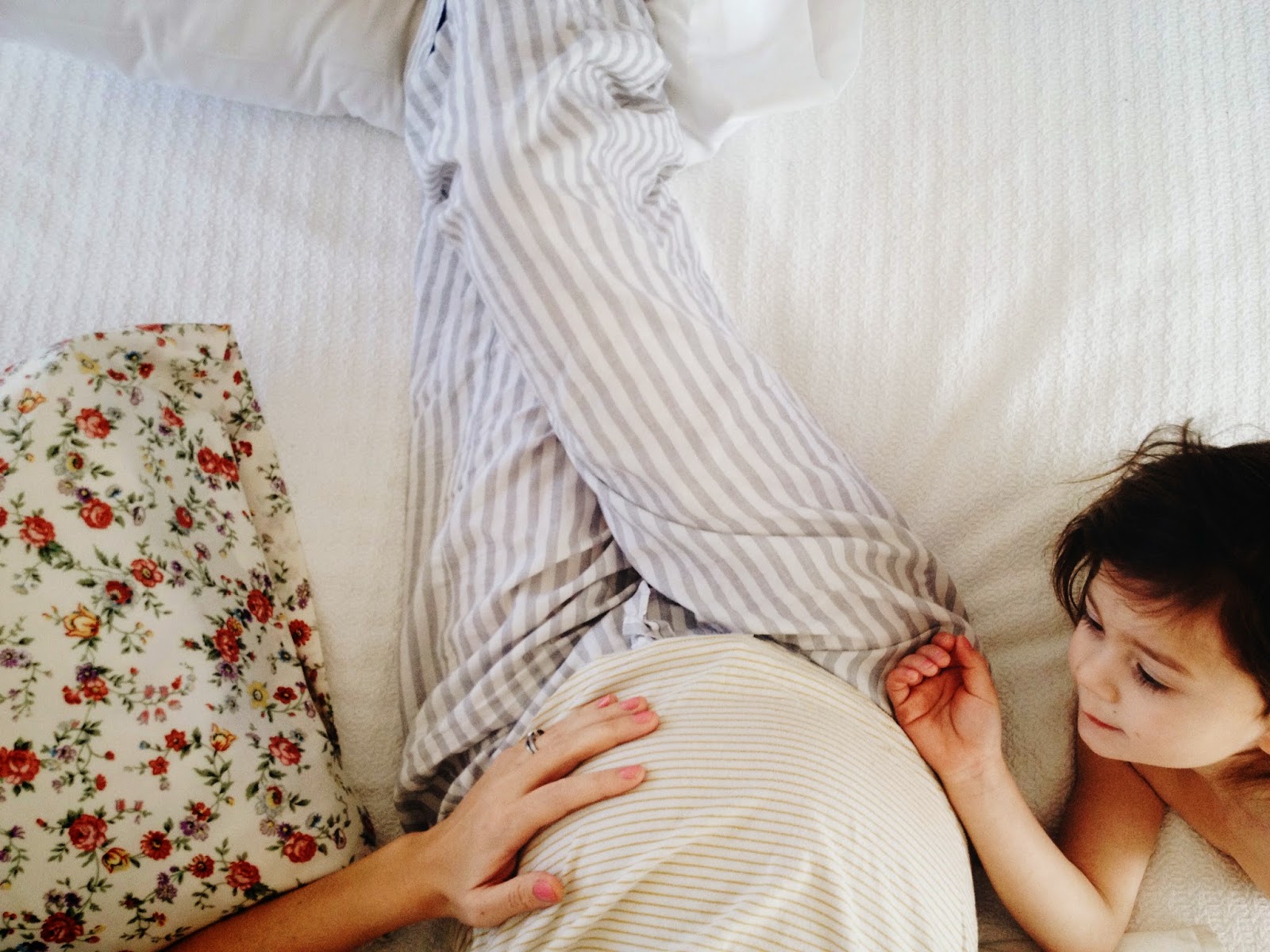 caring our third baby has been the most difficult physically speaking, but right alongside the tumultuousness has come the most surprising cadence of calming waves crashing my shoreline whenever i seem to need a solid reminder that although difficult, this process is so good and so beautiful. here is an example of one of those calming waves: stella came up to me in bed the other morning and gave me a hug. my contacts were not yet in, my eyes were barely open, but open enough to see her standing there in nothing but reindeer pajama pants. my belly, now starting to round and fill out, grazed hers as she leaned in, gently reminding her that she is going to be a sister again. without hesitation, she bent down and kissed my bare stomach. twice. and then she went about twirling on the floorboards of our bedroom, requesting cereal and daniel tiger. it was short and sweet, yet still, i was left speechless and in tears.